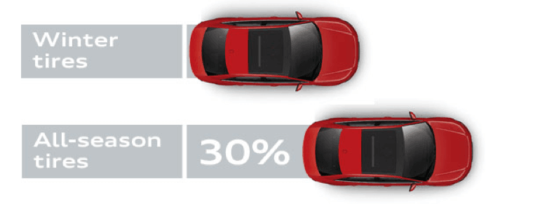 On dry pavement, with temperatures just below freezing, the stopping distance for vehicles equipped with all-season tires is 30% longer than for vehicles equipped with winter tires. Audi Genuine Winter Wheels & Tires will help improve safety and performance to keep you and your family safe this winter.